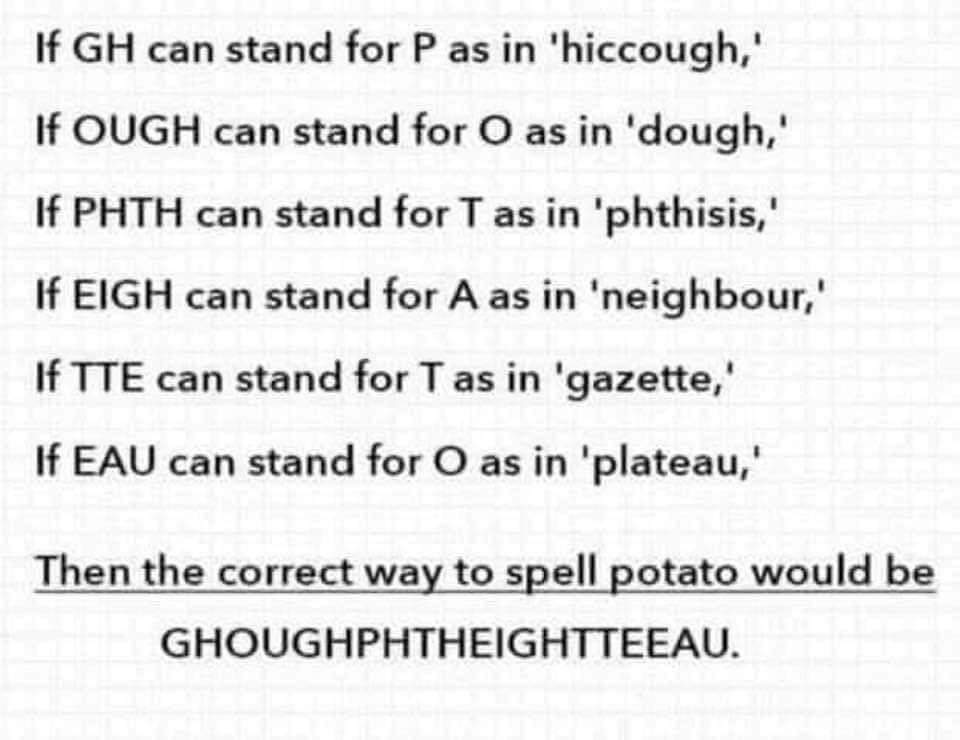 When I was in high school, I thought I was pretty clever. Of course, I was, but my successes aren’t important right now. I had heard about the word, “ghoti,” attributed inaccurately to George Bernard Shaw. To summarize, when you take the way “gh,” “o,” and “ti” are pronounced in other words, you can justify pronouncing ghoti the same as you would pronounce the word, “fish” (click through for an explanation). Here’s where my cleverness comes in. Whenever someone as smug as I told this story, I told them that Shaw and they weren’t thorough in their spelling. The correct spelling of “fish” was actually “ghotib.” The ‘b’ on the end is silent, like in dumb.