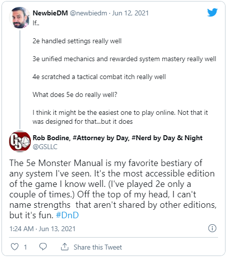 So, all but one of the responses I saw to NewbieDM’s tweet mentioned accessibility, and that’s great, but only one mentioned anything else. This shared observation answers NewbieDM’s question as such: Other than accessibility, the consensus is that 5e doesn’t do anything better than any prior edition of D&D. This isn’t a fatal flaw, of course, because 5e is fun, and people are sticking with it. Perhaps a focus on accessibility is the best approach. After all, 5e is reported to be selling better than all previous editions, but that observation seems to ignore another part of the bigger picture. Could they have done even better if they had taken a different approach? Is the reason for their unprecedented success based on other factors that didn’t apply before (and may not apply in the future)? Despite the success, is there yet another lesson to learn for other game designers? Well, that’s for my next post on these Twitter thoughts and will probably be far more controversial.