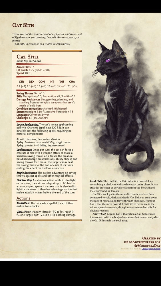 First, there was the dinosaur cat. Now, you have the cat sith. With an intelligence of 16, wisdom of 17, and spellcasting to boot, this is a much greater threat, and perhaps one that could be quite surprising to the average party. One thing that’s disappointing is that the creator uses the term “sith,” yet there’s nothing Sith-like about its powers. No telekinetics, no mind control, and, of course, no weapon use. That seems odd.