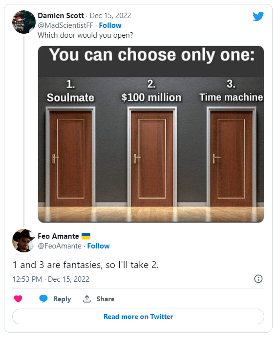 And that’s when the line is delivered. Al wants to make sure that he’s back in the real world, so he asks his son, Bud, “What’s more important: Love or money?”