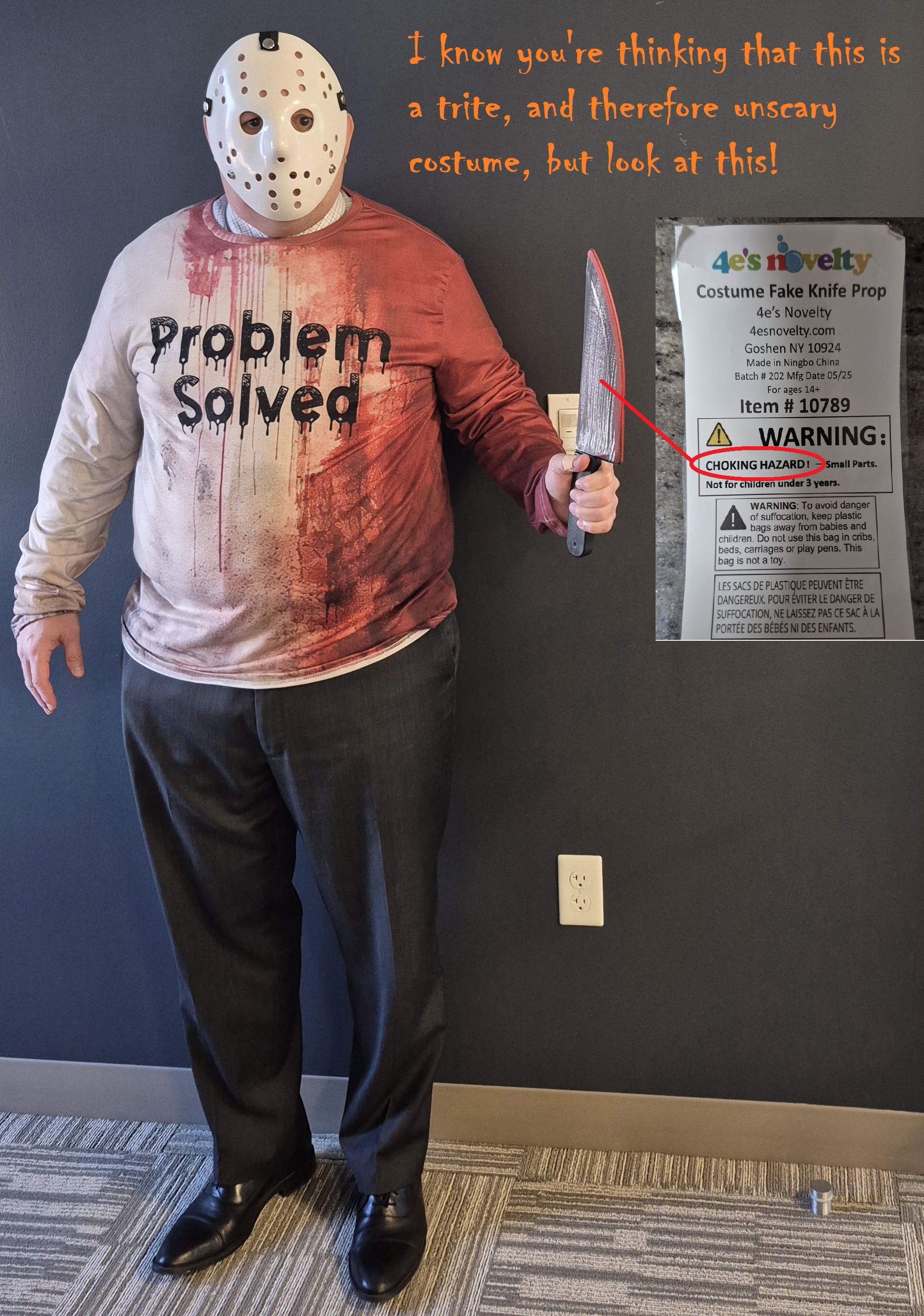 I’m in the unfortunate position of not being able to fully participate in my company’s Halloween costume contest. I have to wear something that can be quickly removed and put back on, so things like face paint are out of the question. In order for people even just to like my costume, I have to tell a story. Last year, I wore a prison jump suit. This year, I give you the prequel to that costume.
