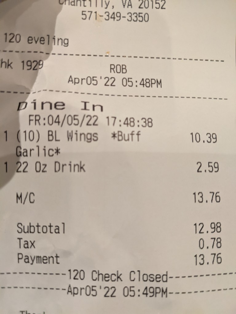 I’ll give you a hint: There’s no fork. I had to “mama’s little piggy” this. Okay, not really. I just had to ask for one. It’s not as if this affected the quality of the food; however, it does show how much the staff bothers to get things right. Okay, last thing. Here’s my receipt.