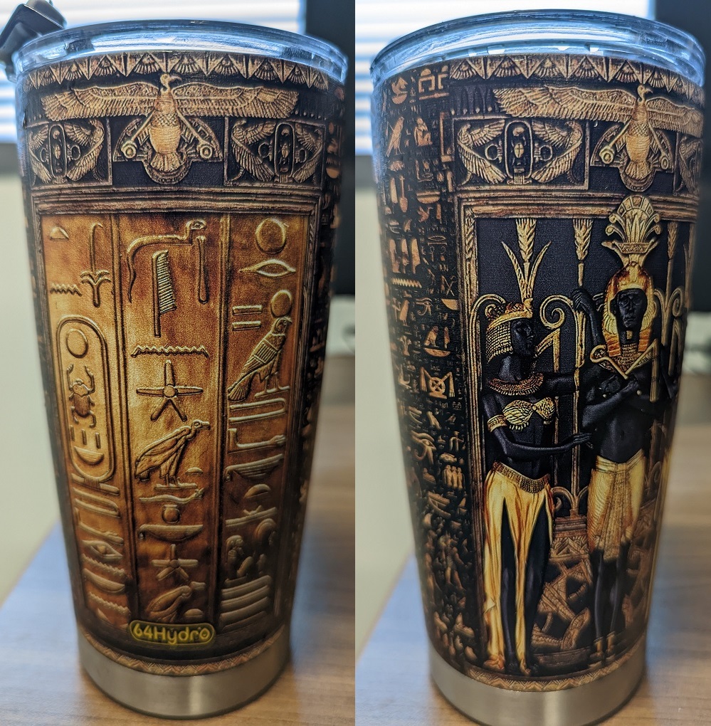 It’s an overpriced tumbler (duh!) with ancient Egyptian imagery. As a mythology nut, I love imagery from ancient cultures, and this is some of the good stuff.