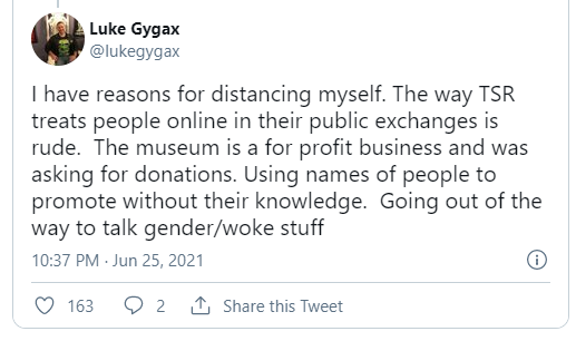 I have reasons for distancing myself. The way TSR treats people online in their public exchanges is rude. The museum is a for profit business and was asking for donations. Using names of people to promote without their knowledge. Going out of the way to talk gender/woke stuff