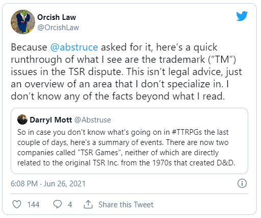 Because @abstruce asked for it, here’s a quick runthrough of what I see are the trademark (“TM”) issues in the TSR dispute. This isn’t legal advice, just an overview of an area that I don’t specialize in. I don’t know any of the facts beyond what I read. https://t.co/kyCZEH9ApG