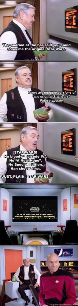 “Star Trek >> Star Wars” is a phrase I use more than “My name is Rob,” but as Kessel Junkie will tell you, we’re both fans of both. I just prefer Star Trek, and he prefers Star Wars. But the only Star Wars that doesn’t appeal to me is the animated stuff (for reasons I’ve discussed before) and the Last Jedi (it reminds me too much of the OJ Simpson slow speed chase). Maybe my love of Star Trek is why Rogue One is my favorite Star Wars movie; it has a more Star Trek feel. In any event, don’t take it as an insult to the franchise. Star Wars continues to consistently put out great material, and they even adjust on the fly to cater to what the fans suddenly want to see (e.g., Ahsoka). To be fair, Star Trek did that with Strange New Worlds.