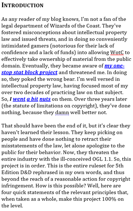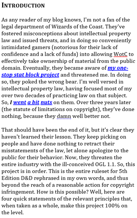 This, by the way, is exactly what WotC would have had to do if they were taken to court over the OGL, and they would have succeeded by simply reading my posts to the Court. However, as I said, how CC-BY-4.0 is applied is a little bit better than the OGL. It avoids some of my concerns, and for all we know, it could be upheld by courts for that reason. It could also be upheld because it’s been used successfully in other industries almost since its first publication. Everyone’s been cool about its use. No one’s been an asshole. Therefore, the CC-BY-4.0 gives the gaming community time to adjust and diminish WotC’s stranglehold on the industry.