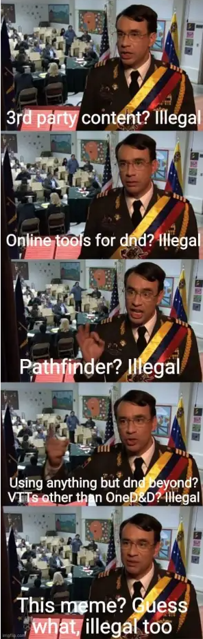 I don’t really have a dog in this hunt. I don’t play 5th Edition anymore, I own every WotC/TSR product I’ll ever want, and I’m not creating content for others. With my 1st Edition Dungeons & Dragons Character Builder functional, that could change if I get it into a suitable form for publication, but the last time WotC threatened me, I told them to pound sand, and they immediately blinked. They can’t harm me because I know they’re full of shit (as are their licenses). I know what I can and can’t do, and I don’t care whether they acknowledge that publicly. But mark my words: This will happen again. Most of you didn’t listen to me the first time, so I don’t expect you to listen to me now, because even those of you that did listen seem happy living in the “open gaming license” hole they’ve dug for you.