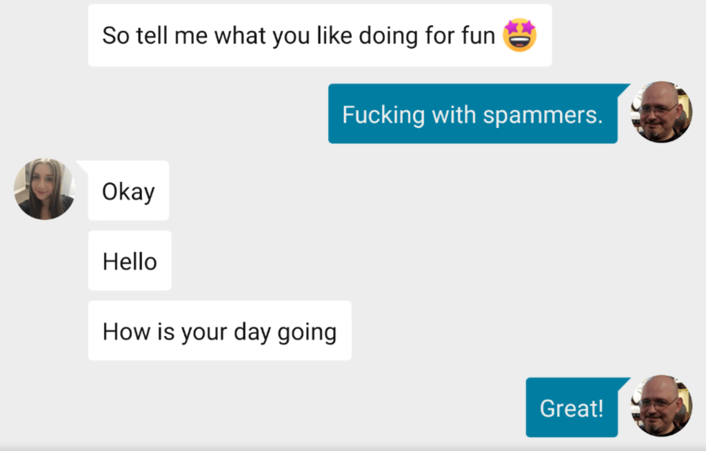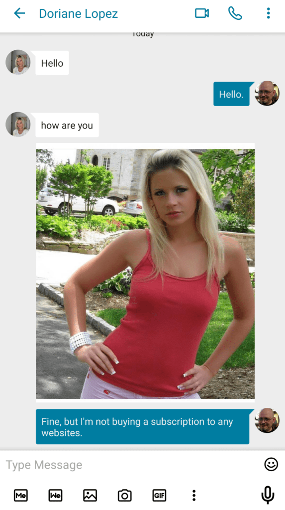 I almost called ” Doriane ” out right then and there, but I wanted to have some fun. I’m going to keep playing with “Doriane” as long as I can. If necessary, I’ll be proactive and reengage myself with one of my own selfies. In the mean time, I’ll have fun with one of her friends.
