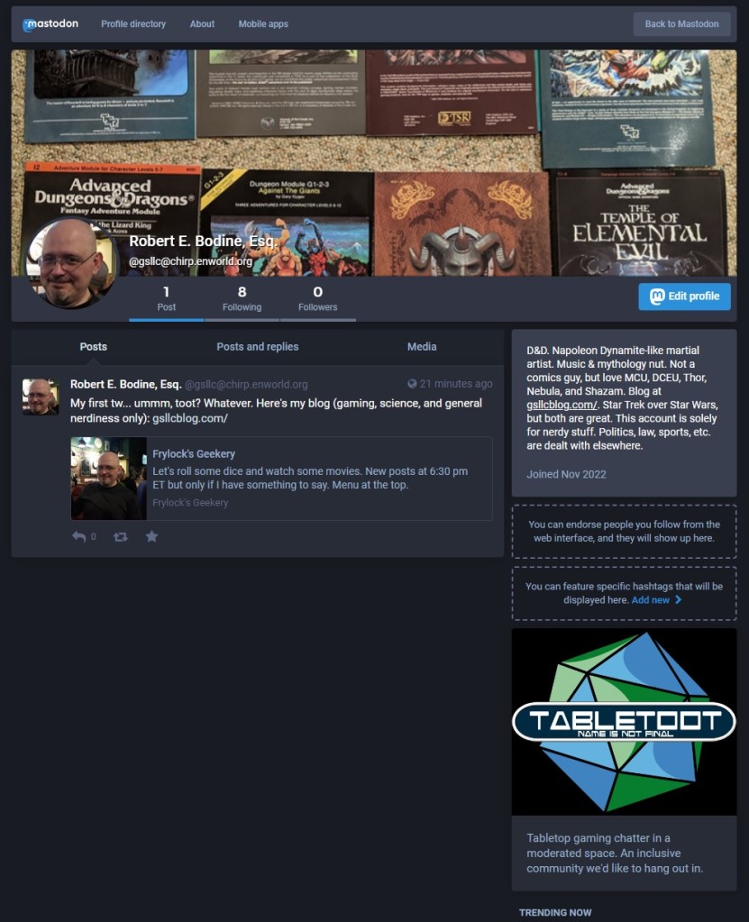 First, if you go to Mastodon.com, you’re screwed. It won’t work. So, how do you do it? The best way to get on Mastodon is to know what server you want to join. In my case, I went with https://chirp.enworld.org/web/home. Another popular one for nerds is https://dice.camp/explore. I applied for membership 🙄, which was accepted. Mastadon.social appears to be the baseline, as a few celebrities are on there, but it doesn’t allow signups for some reason (maybe it’s just me). However, I learned that you don’t have to be on a server to follow someone on another server. As long as you see them appear in your server through a re-toot (yeah, their “tweets” were called “toots,” but now they’re called “posts”), you can follow them. I’m not sure how that works, but it does, so there you go.